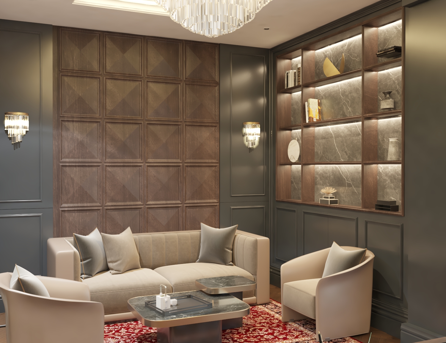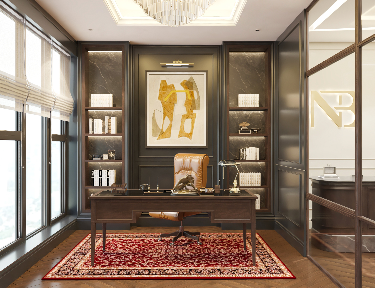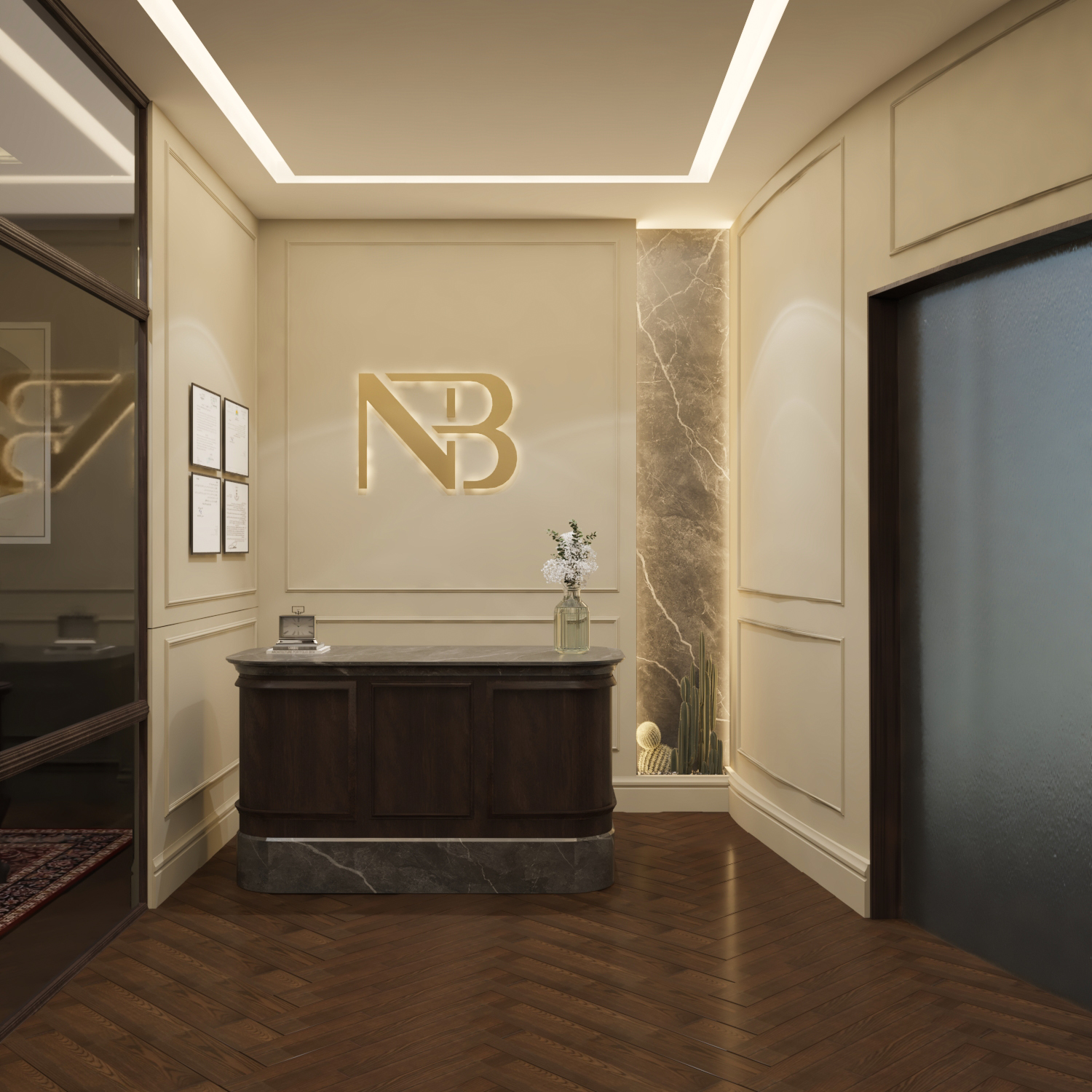The law office features a sleek and professional design with calm neutral tones and elegant wood accents.