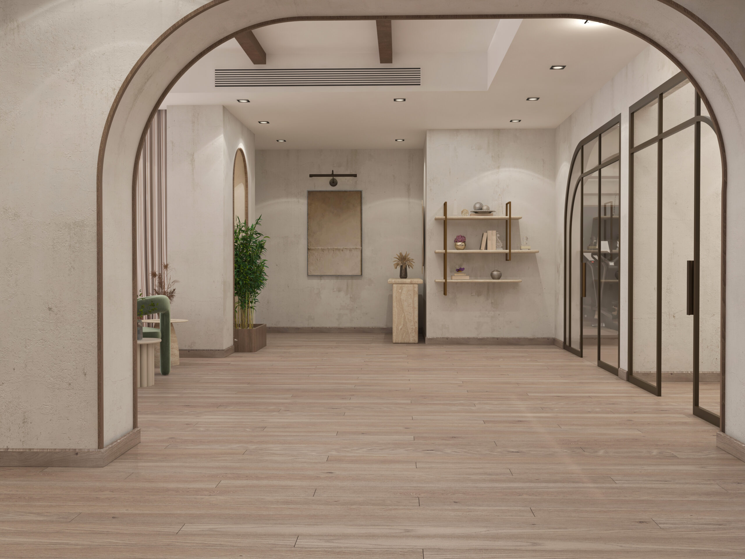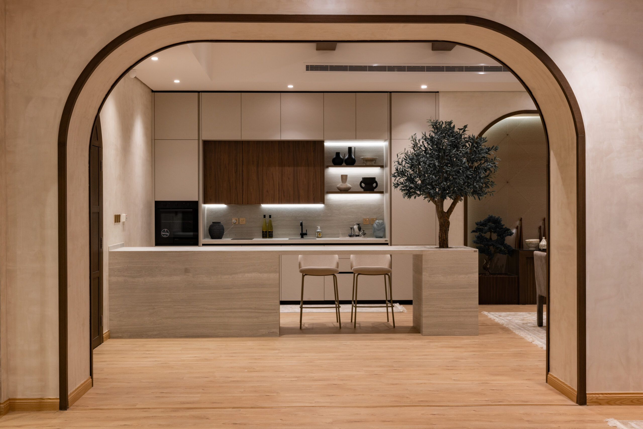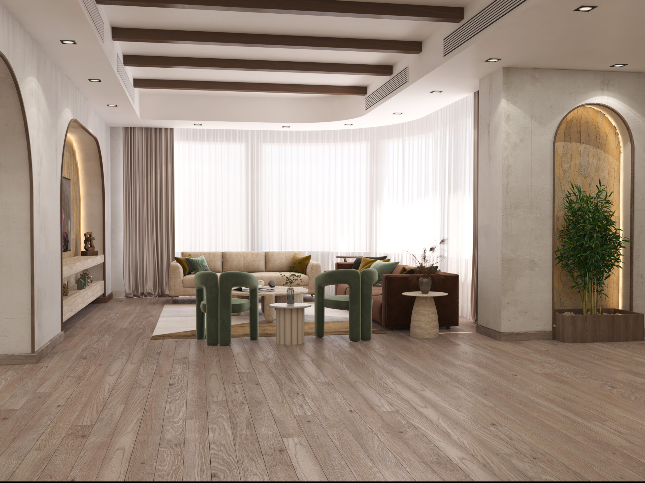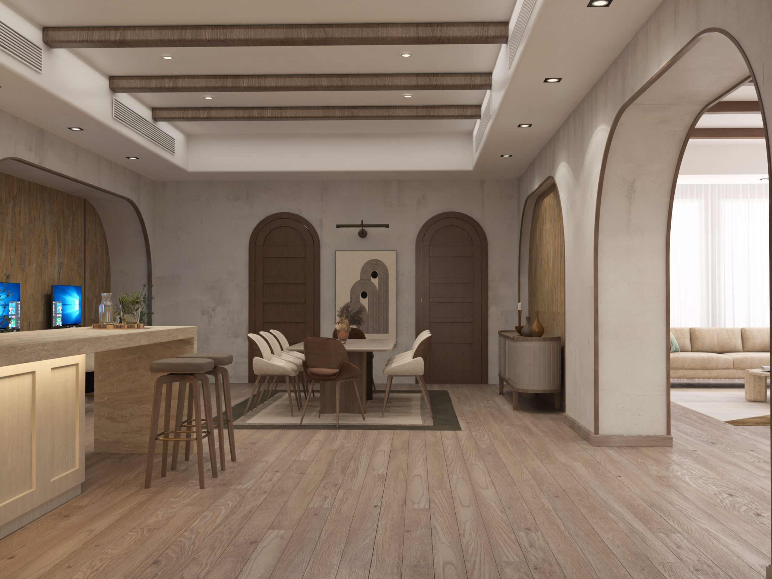 A Modern Organic design featuring soft neutral tones, natural materials, and smooth curved forms, creating a calm, warm, and contemporary atmosphere with clean, uncluttered spaces.