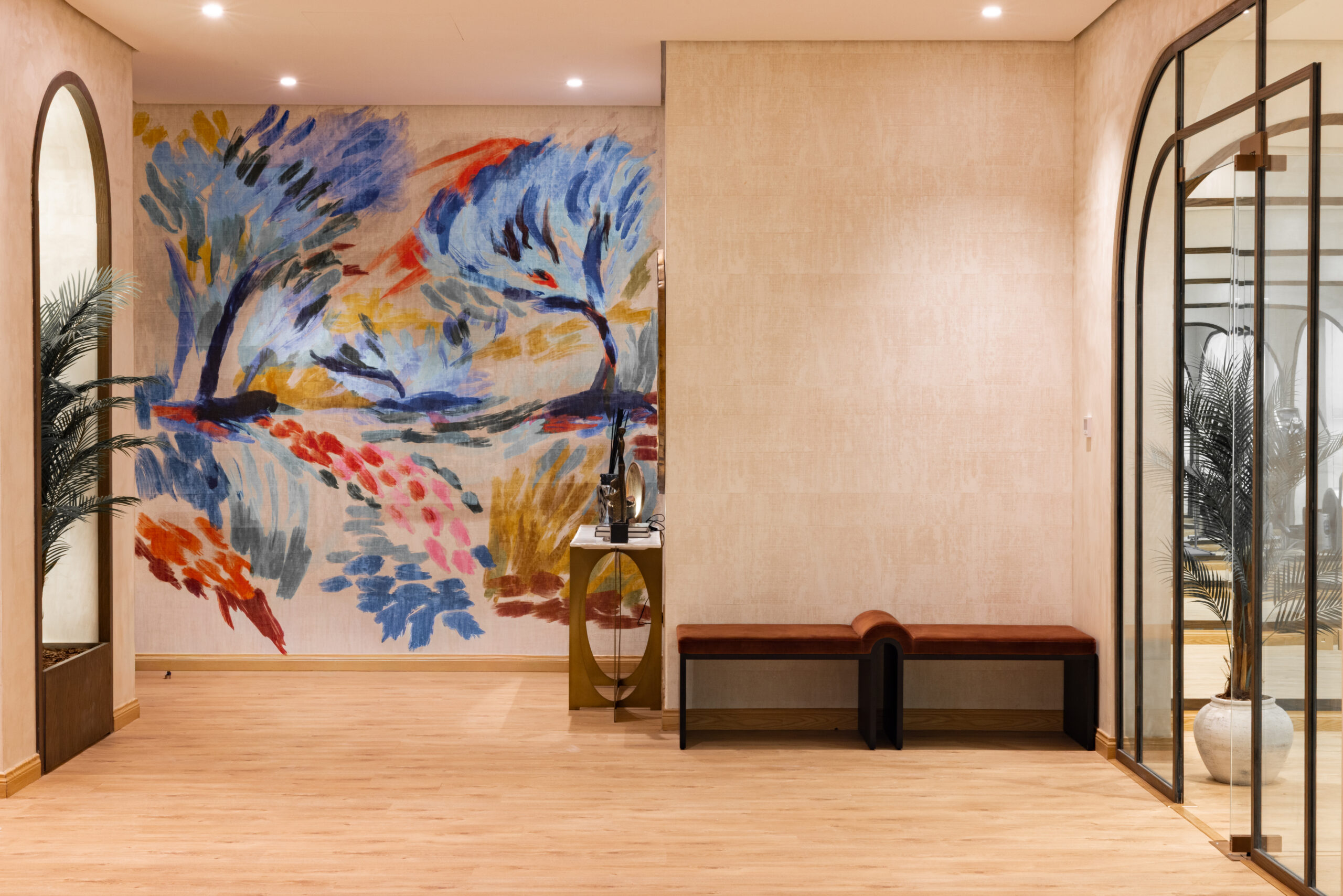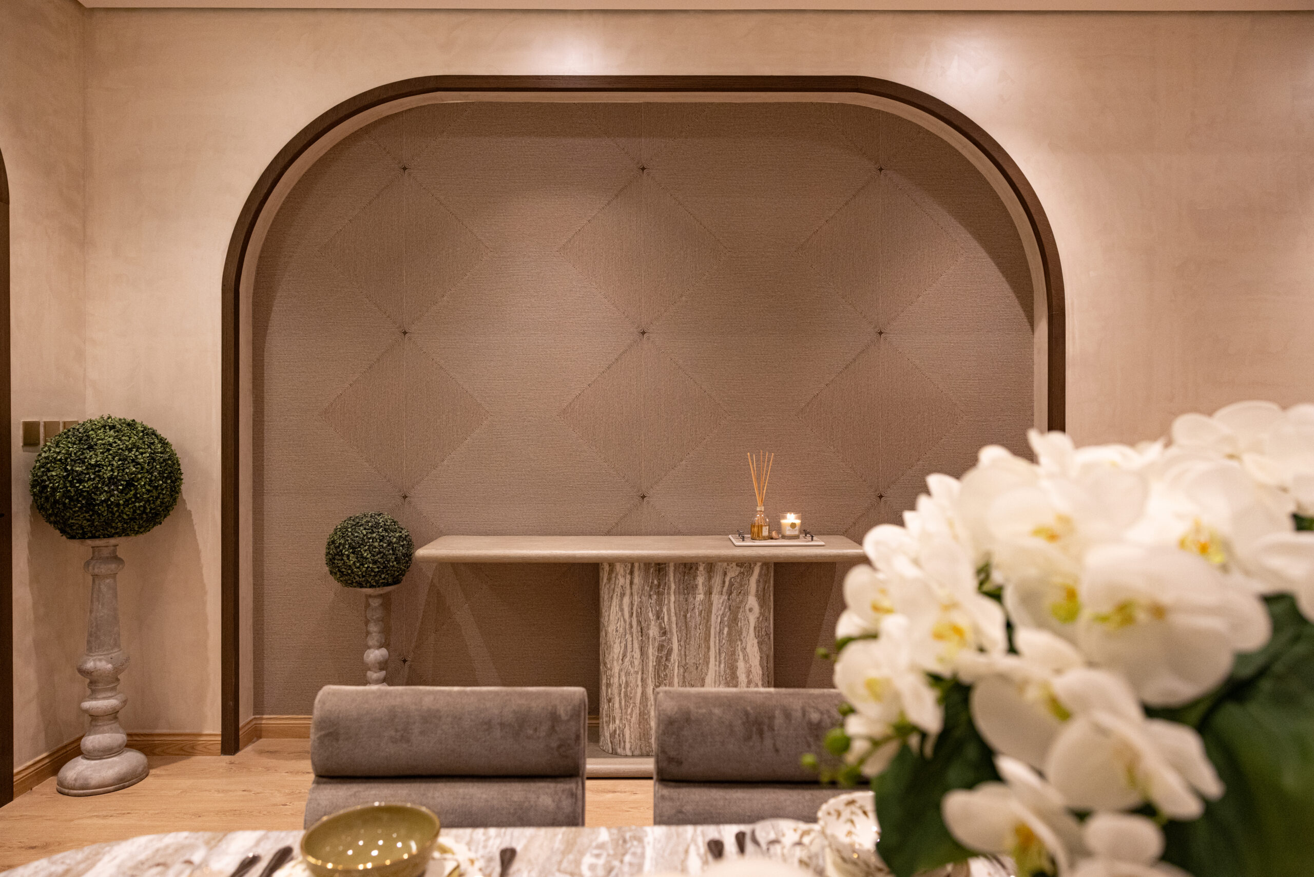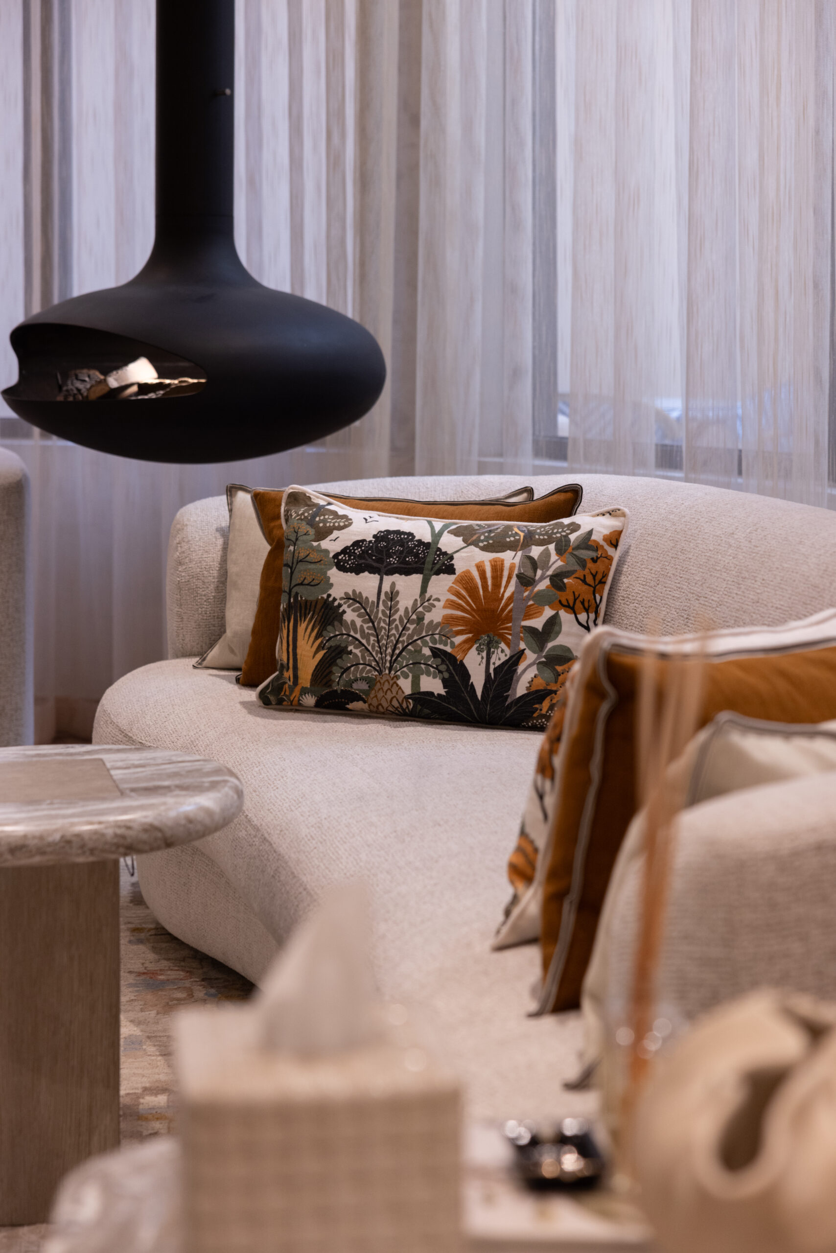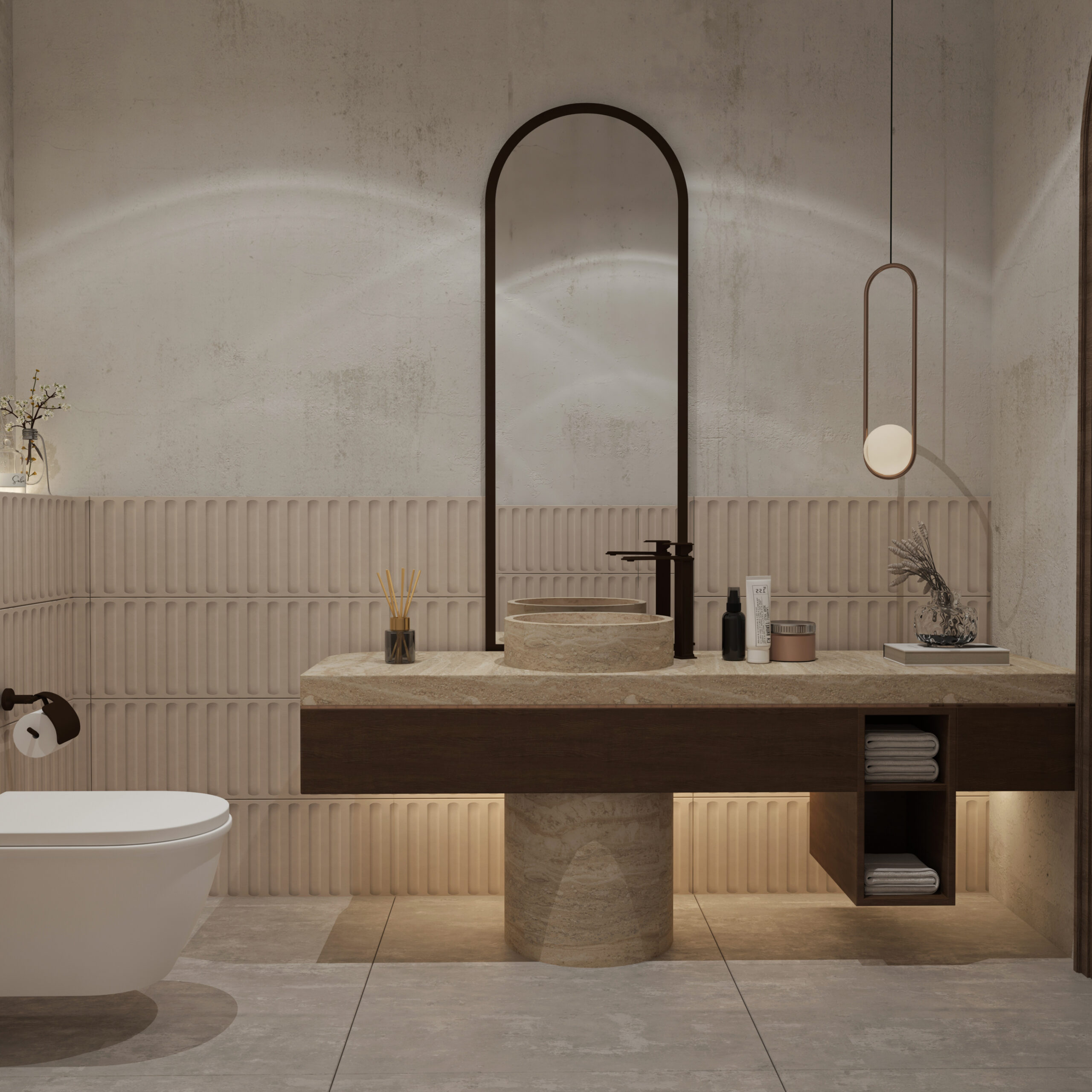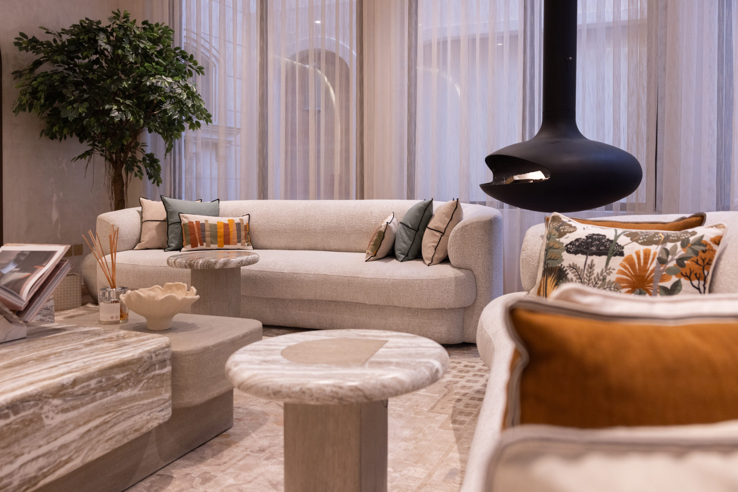 A Modern Organic design featuring soft neutral tones, natural materials, and smooth curved forms, creating a calm, warm, and contemporary atmosphere with clean, uncluttered spaces.