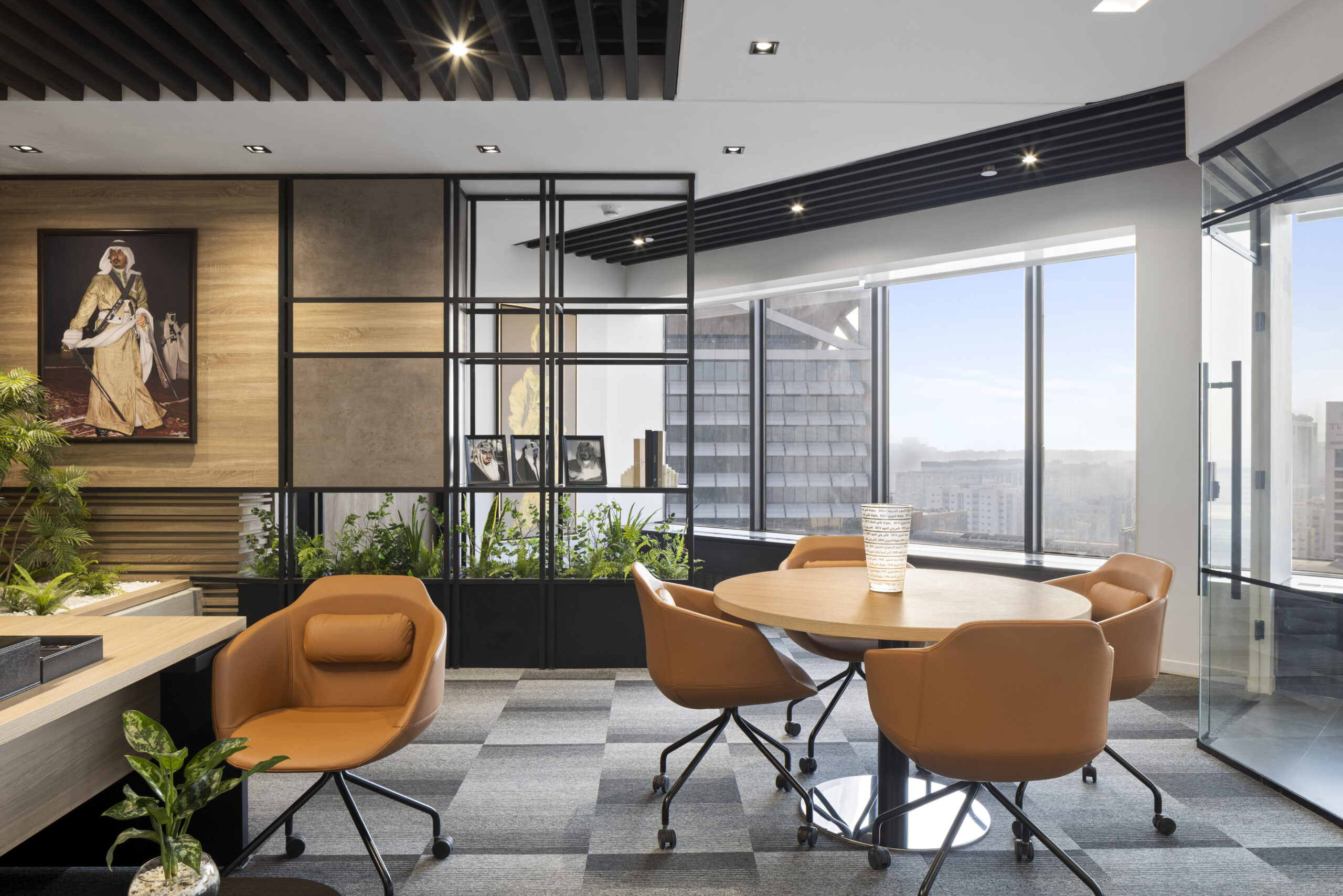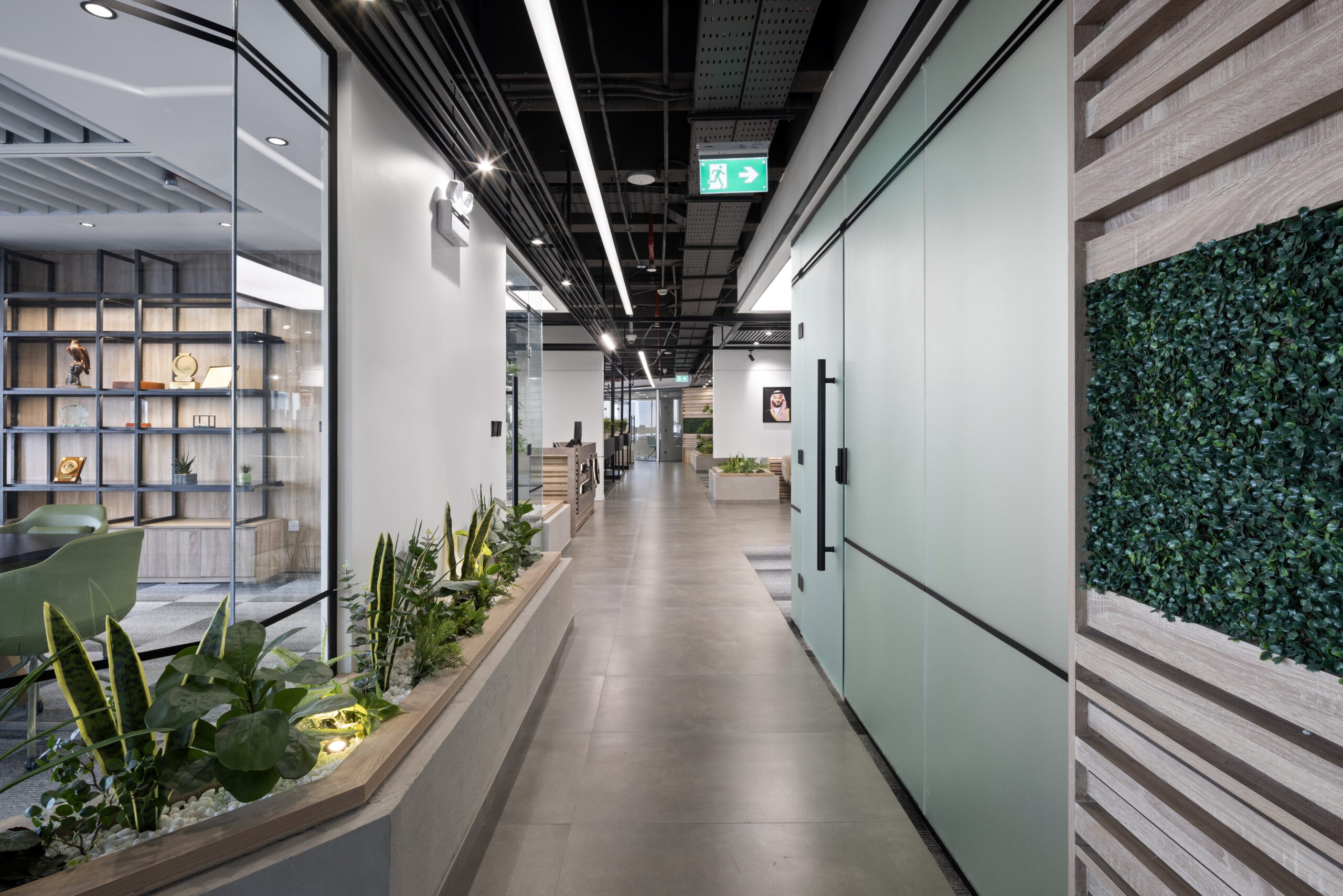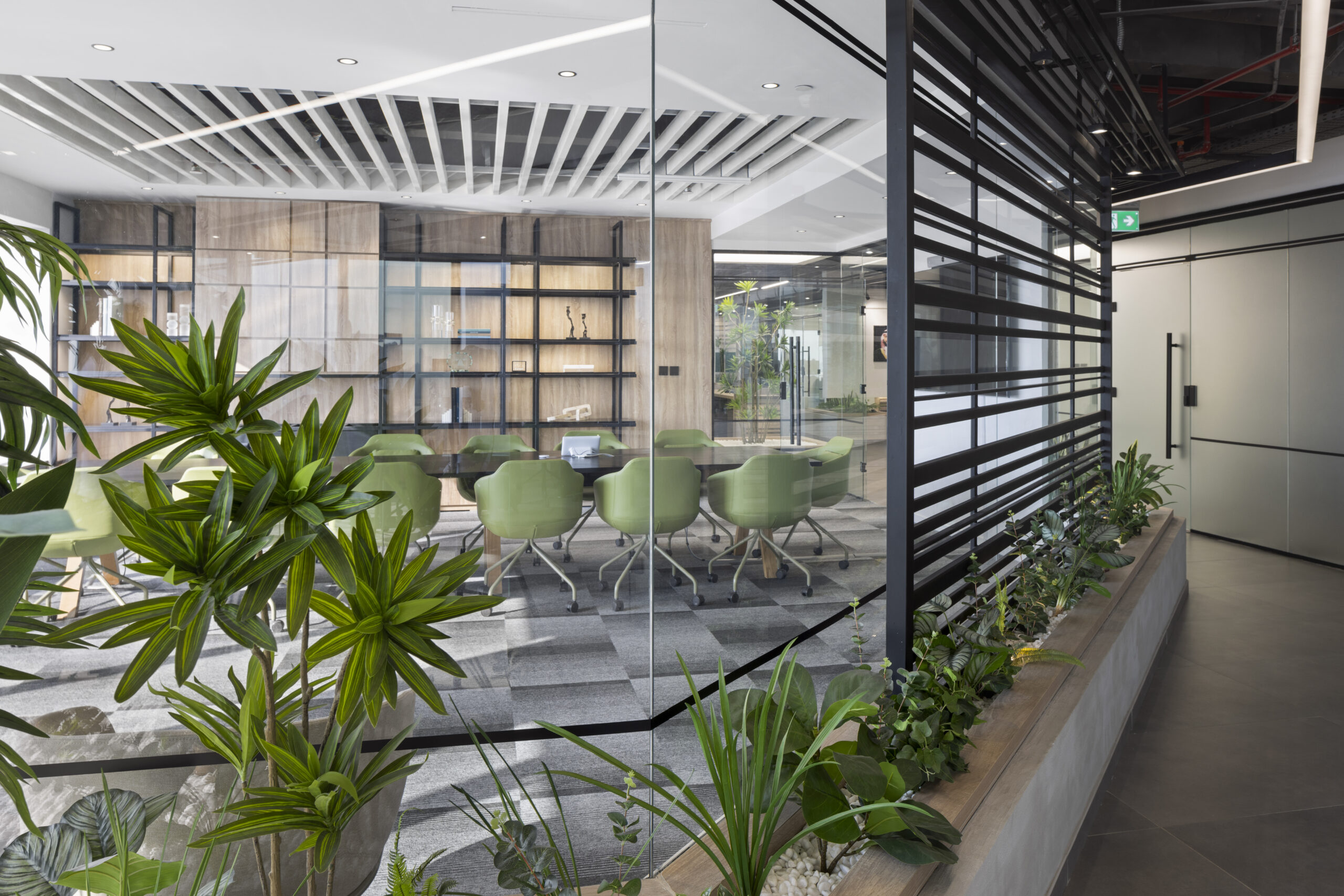 Modern office designed for a calm, collaborative environment with open workstations, private offices, manager suites, and a meeting room. Features include indoor landscaping, sound-insulation systems, and imported furniture supplied and installed for workstations, executive offices, and meeting areas, combining aesthetics, functionality, and productivity.